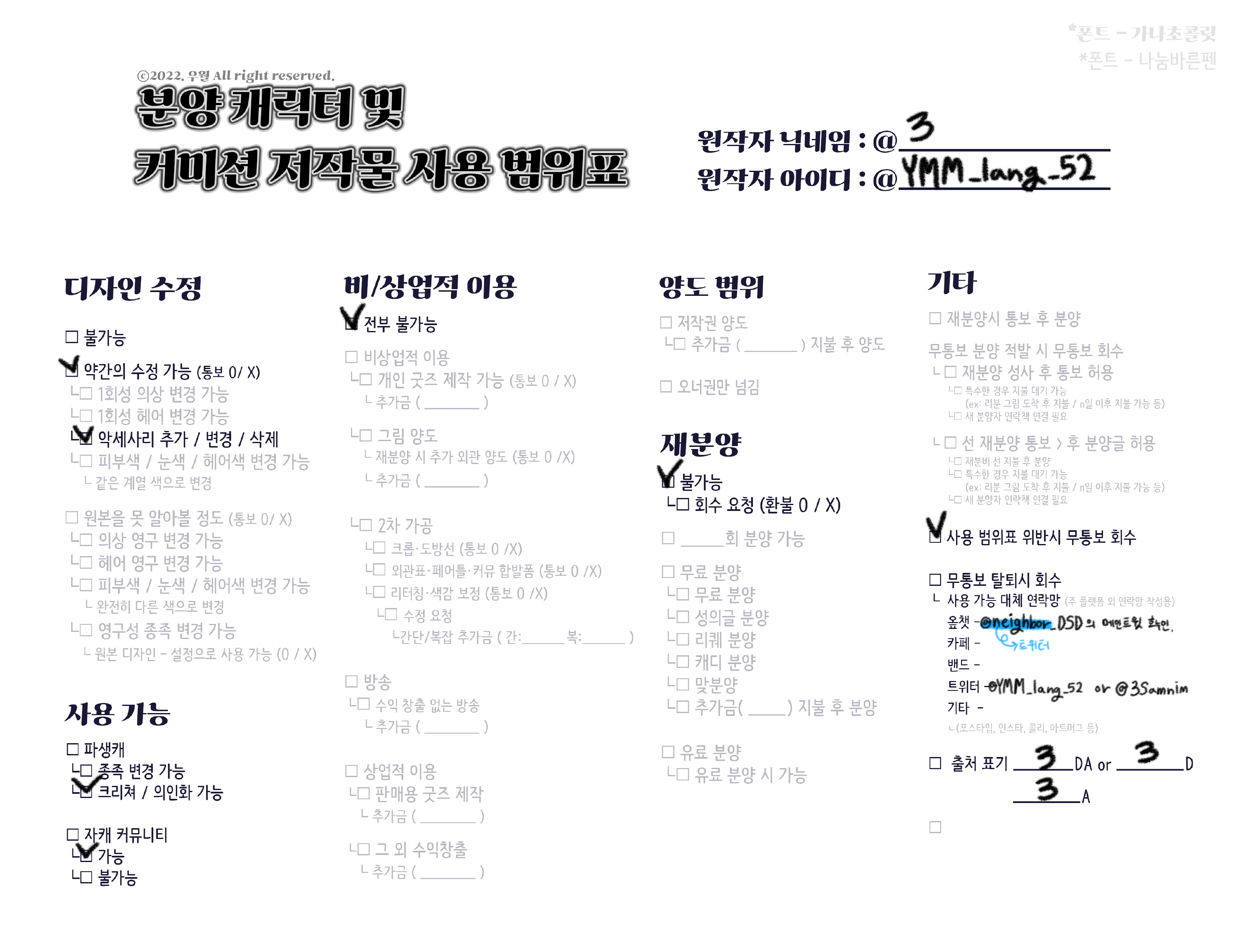 비/ 상업적 이용: 개체 자체에 적용됩니다. 스스로 그린 것일지라도 개인굿즈 제작 및 이하 관련 이용이 불가합니다.